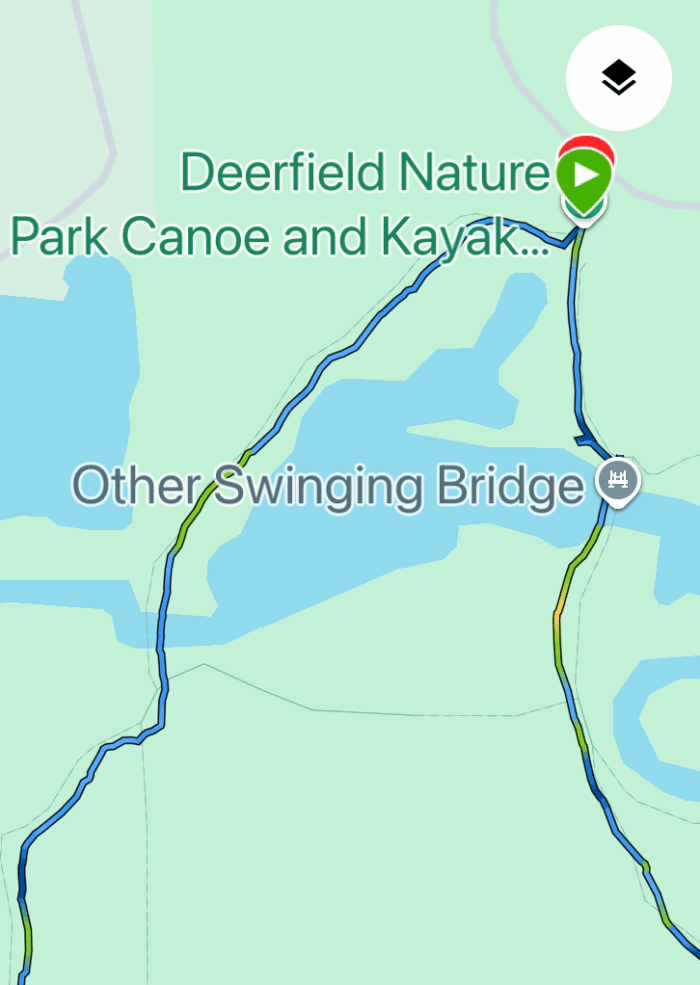 I lumbered along quickly through the dark using my headlamp with hopes of miles in my feet and an SD card full of pics by the end. While I did indeed get my miles in (6.32), my camera’s SD card was pretty underutilized for most of the hike, with my only “good” photos coming with less than.25 miles to go, when, as I crossed the ill-named “Other Swinging Bridge,” I saw a Great Blue Heron poking around in the water. No fish were eaten this time, but after nearly the whole hike with nothing but a random deer, I was happy with anything.